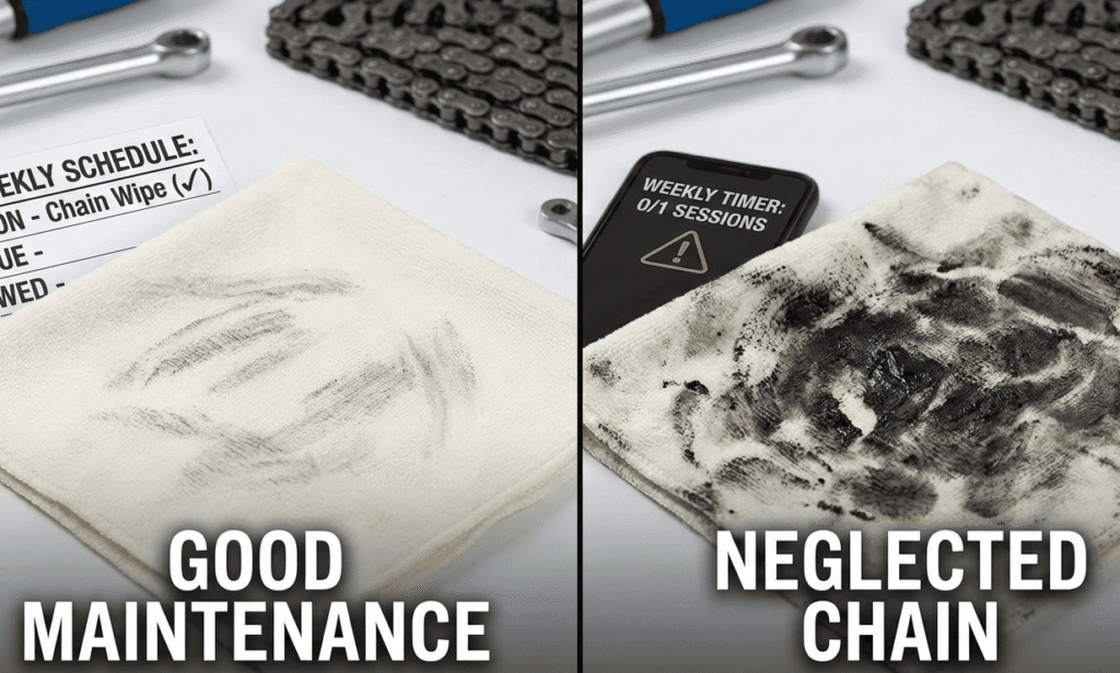 Light, frequent maintenance beats aggressive deep cleans every single time. Wipe your bike chain with a dry rag after every 3-4 rides (that’s 150-200 miles for road, 75-100 miles for MTB depending on conditions). This 90-second task removes surface contamination before it bonds with your lubricant and forms that grinding paste that sounds awful and feels worse.