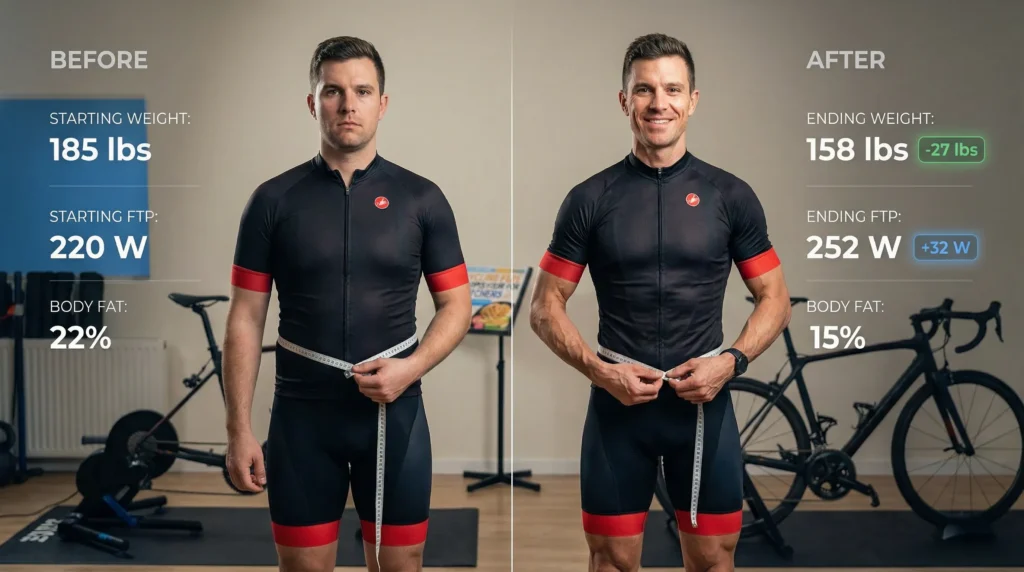 12 weeks later: down 24 pounds of pure fat, FTP increased by 32 watts, and I actually have energy. The difference wasn’t more suffering—it was smarter structure and proper fueling. The cycling diet protocol in the program is what finally made everything click. HIIT cycling works, but only when you stop sabotaging it.”