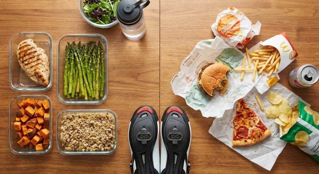 The trap everyone falls into: thinking you can out-train a terrible diet. You can’t. A 45-minute HIIT session burns roughly 400-600 calories. One post-ride “reward” meal? Easily exceeds 800-1000 calories. Do the math.